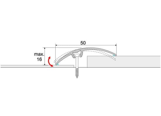 Hliníková vyrovnávacia lišta A65, narážacia na kovové skrutky. Montážny systém po inštalácií nie je viditeľný. Lišta prenáša výškový rozdiel. Priamo v balení skrutky a hmoždinky. Používa sa na spájanie všetkých druhov podláh. Zo spodnej strany lišty je silikónové tesnenie, ktoré zabraňuje klepaniu.